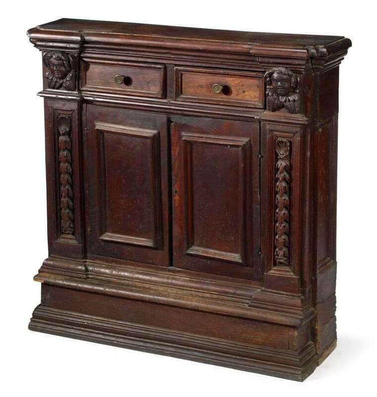 The narrow molded top of reverse breakfront outline, over twin short drawers and conforming cupboard doors flanked by masks and foliate garlands, raised on molded plinth base.