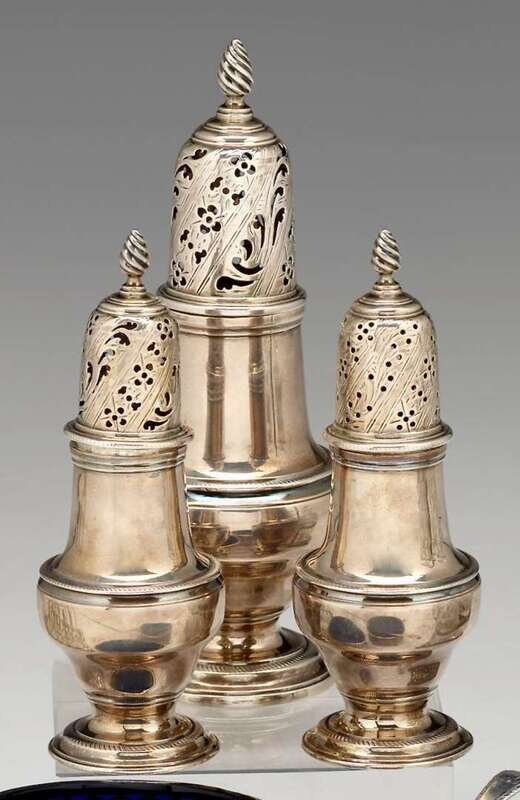 Comprising a sugar, salt and pepper castor, each of typical form with openwork pull of lids and spiral finial.