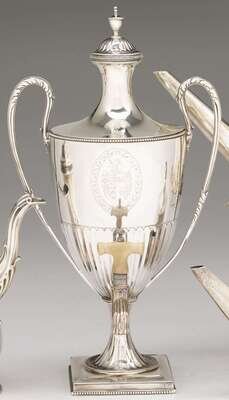 Of fluted form, the lid with urn finial, the whole with beaded edges and upswept foliate scrolled handles, engraved with a coat-of-arms, issuing a fluted tap with ivory handle above a fluted stem terminating in a spread foot on square base.