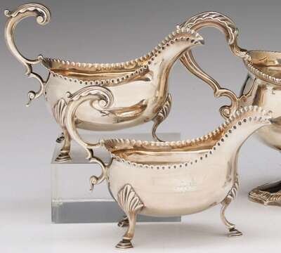 Oval bellied form with leaf capped handle, raised on three shell capped feet, the sides engraved with an heraldic leopard, and initials.
