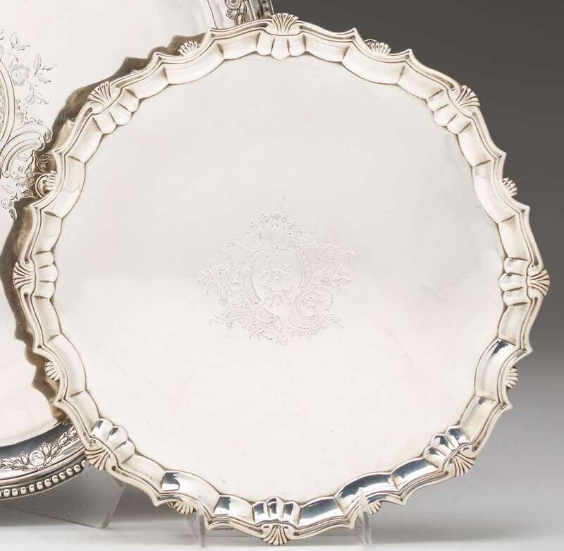 Octagonal form, the shaped edge interspersed with shell motifs, large engraved armorial crest in the center, raised on shell capped feet.
