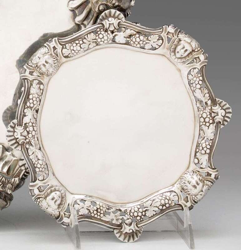 Circular form, with shaped openwork edge, worked to show berries, vines, masks, and scallop shells, raised on three hairy paw feet.