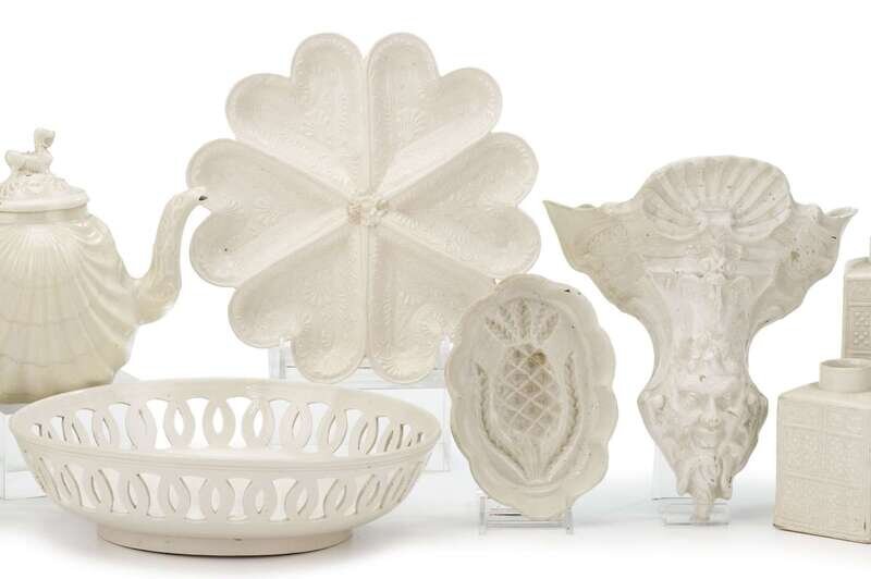 Comprising a lattice carved bowl, scalloped molded dish, butter cover, and Gothic revival wall pocket. (4).