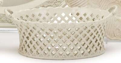 Reticulated oval basket form with two handles.
