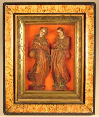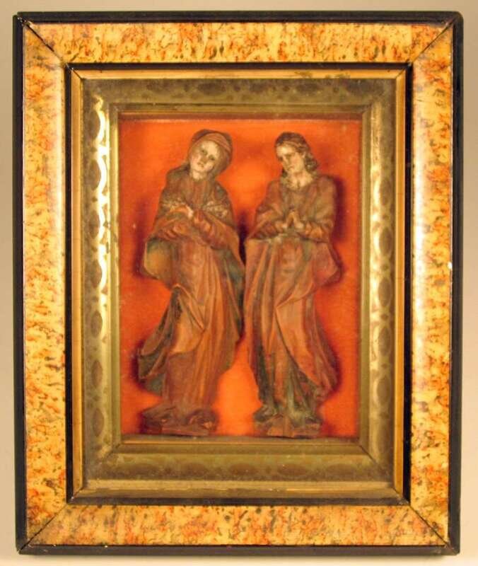 Tall standing female saints, with flesh tone face, in shadow box. (2).