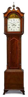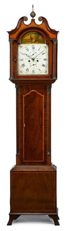 The white enameled dial with roman and arabic numerals painted with a scene of a shepherd with flock and woman in a landscape, the hood with broken swan neck pediment above glazed door flanked by columns capped with brass corinthian capitals, over conforming case with single crossbanded door, raised on shaped bracket feet.