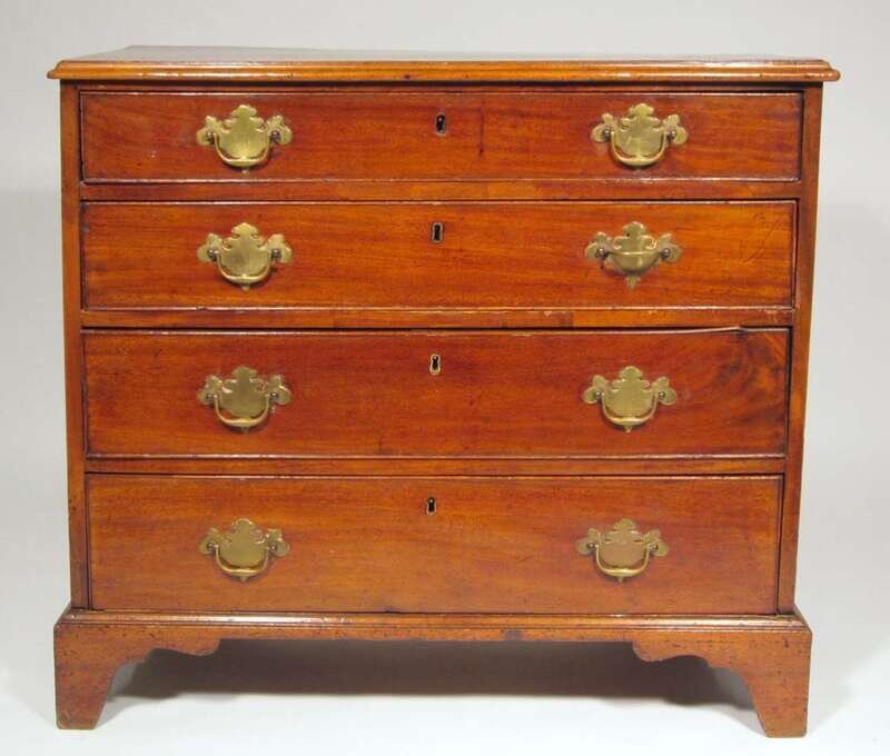 The rectangular top with molded edge over four cockbeaded graduating long drawers, raised on shaped bracket feet.
