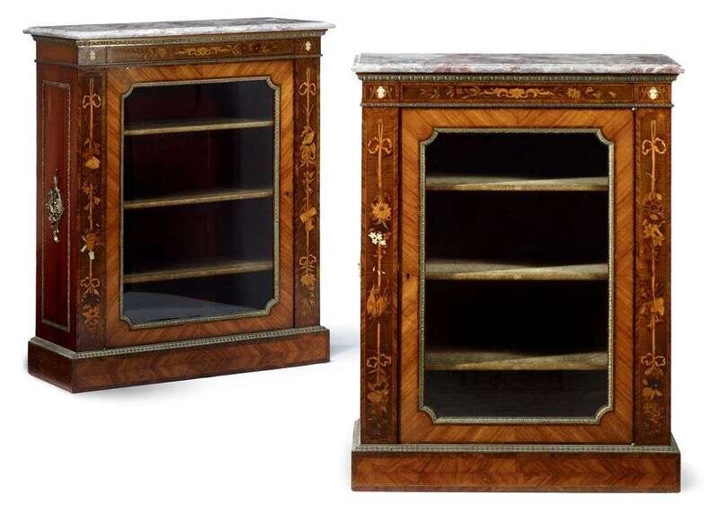 Fine pair of Victorian marble top ivory and marquetry inlaid harewood and tulipwood cabinets attributed to lamb of manchester