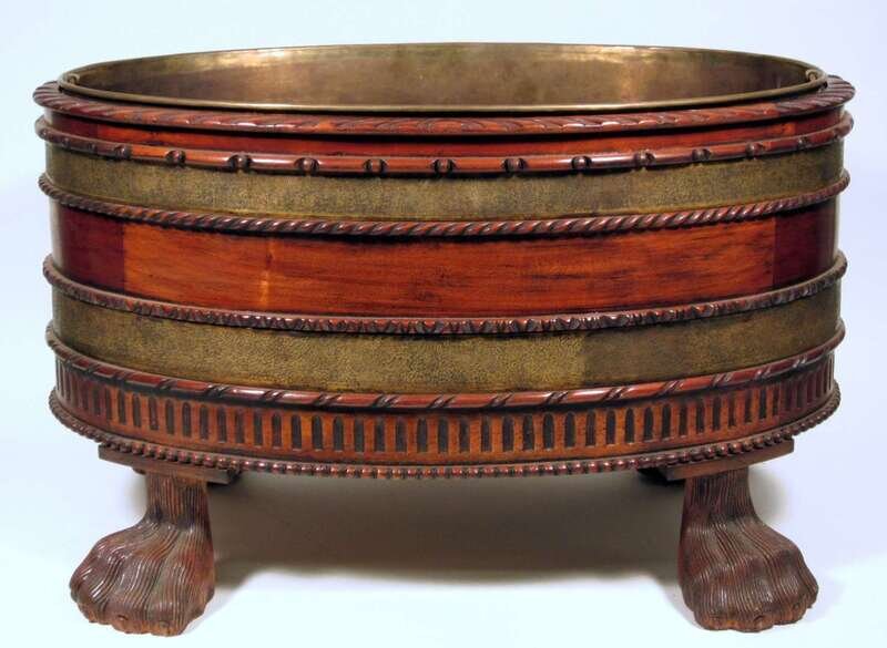 Oval form, with gadrooned rim and brass liner, raised on hairy paw carved feet.