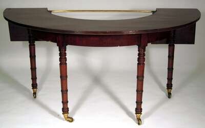 Narrow D-shaped top with reeded edge, raised on four turned legs terminating on brass castors.