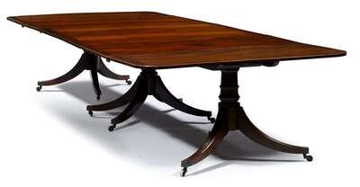 Regency flame mahogany, rosewood crossbanded and satinwood strung triple pedestal dining table early 19th century with restorations