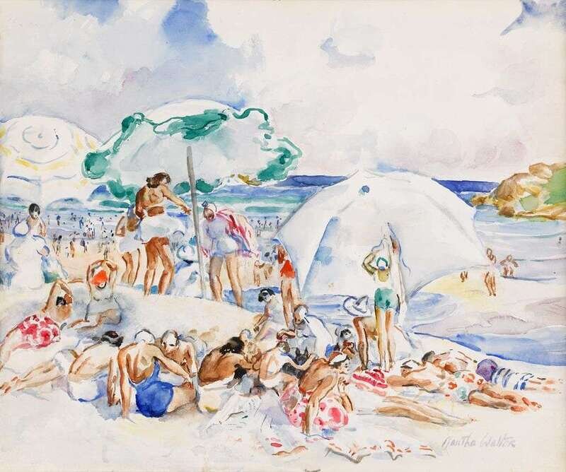 MARTHA WALTER (AMERICAN 1875-1976) "UMBRELLA ON BASS ROCKS BEACH"
