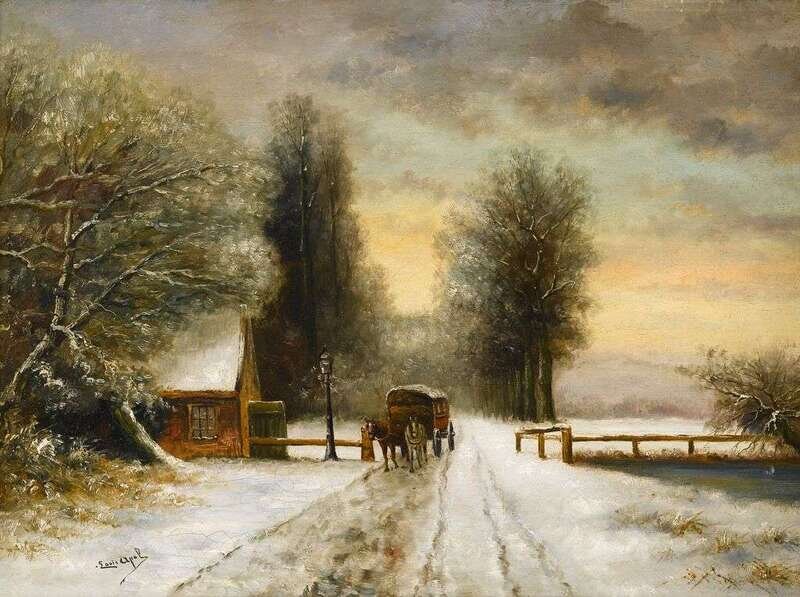Signed 'Louis Apol' bottom left, also inscribed 'Hollandische Winterlandschaft mit Haus und Pferd' on label verso, oil on canvas