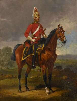 ALFRED F. DE PRADES (BRITISH 1844-1883) PORTRAIT OF A BRITISH DRAGOON GUARD ON HORSEBACK