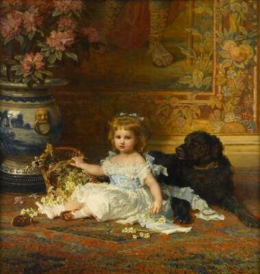 CARL WILHELM FRIEDRICH BAUERLE (GERMAN 1831-1912) PORTRAIT OF YOUNG GIRL WITH A BASKET OF FLOWERS AND HER DOG