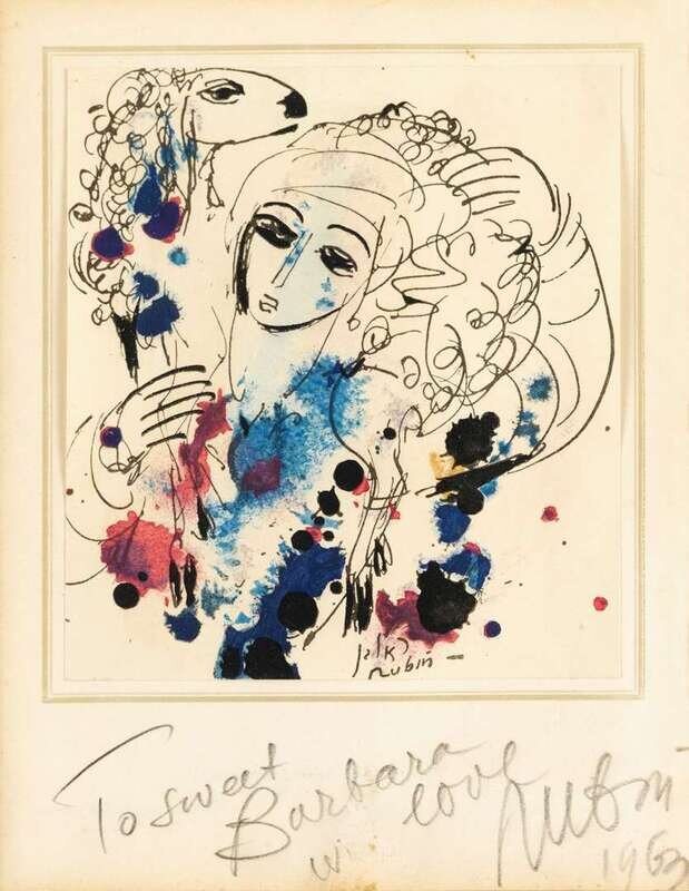 Signed in Hebrew and signed 'Rubin' bottom center, inscribed 'To sweet Barbara / with love / Rubin / 1963' on mat, black ink and watercolor on paper