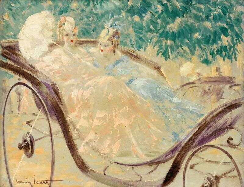 LOUIS ICART (FRENCH 1888-1950) TWO ELEGANT LADIES IN A CARRIAGE
