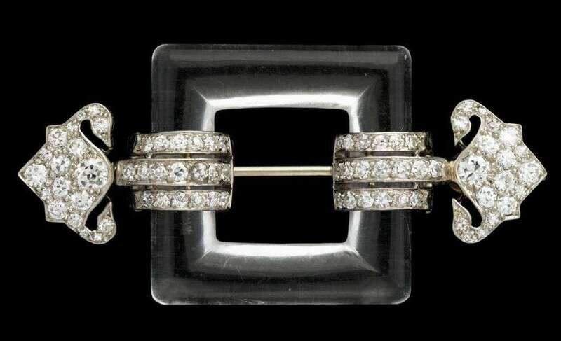 Rectangular polished rock crystal pin, accented on either end by thirty-seven pave set round cut diamonds in modified cartouche shaped mount, signed by the maker, serial no. illegible.