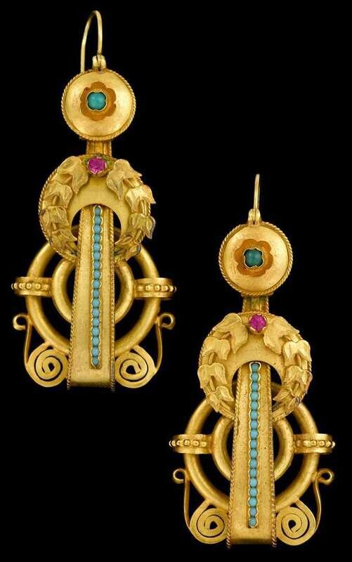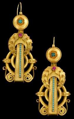 'Etruscan Revival' style drop earrings with applied laurel leaf, turquoise and ruby accent.