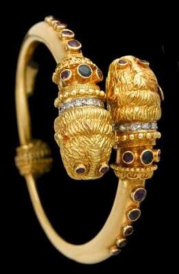 Crossover design terminating in two animal heads accented by ruby eyes, band of bracelet set with fourteen petite round cut diamonds, sapphires and rubies, signed by the maker, Greek hallmarks, 'A. 21'.