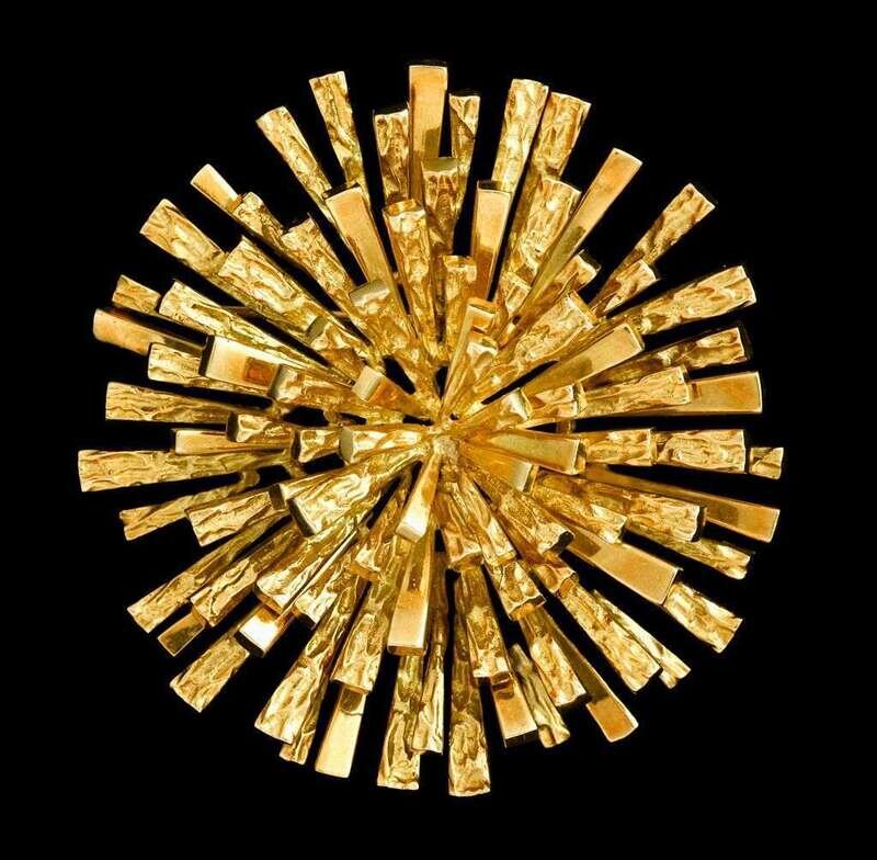 Unusual heavy yellow gold sunburst brooch, polished and textured 'rays'.