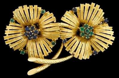 Double flower design, one displaying seven round cut sapphires accented by four petite round cut emeralds, matching flower with seven round cut emeralds and four petite round cut sapphire accents, stamped 'KG' on reverse.