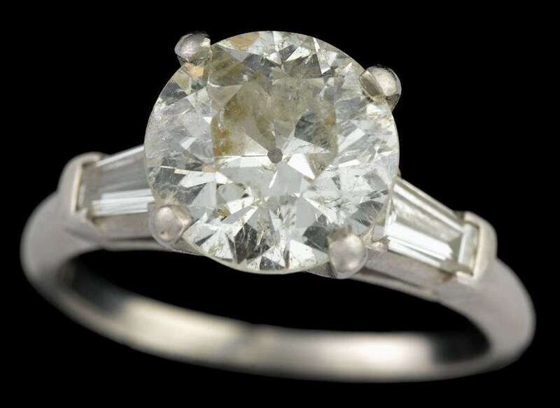 Approximately 2.35 carat Old European cut diamond prong set and flanked by tapering baguette cut diamonds.