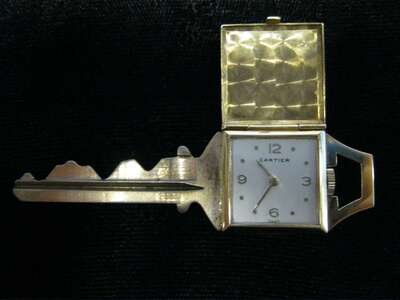 House key set with watch. Square case, silver tone face signed by the maker, mechanical movement signed by J. Schulz, case signed serial no. 472066, Cartier serial no. 18513.