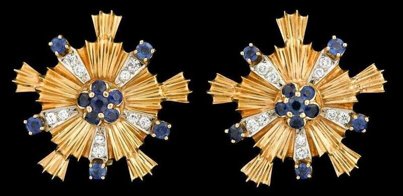 14 karat yellow gold, sapphire and diamond earrings 1940s, in the manner of tiffany & co.