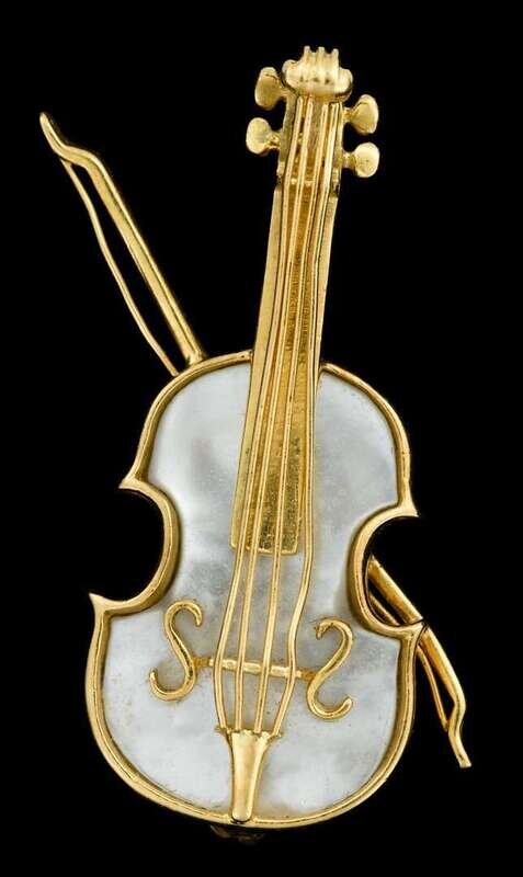 Whimsical 18 karat yellow gold and mother-of-pearl violin brooch