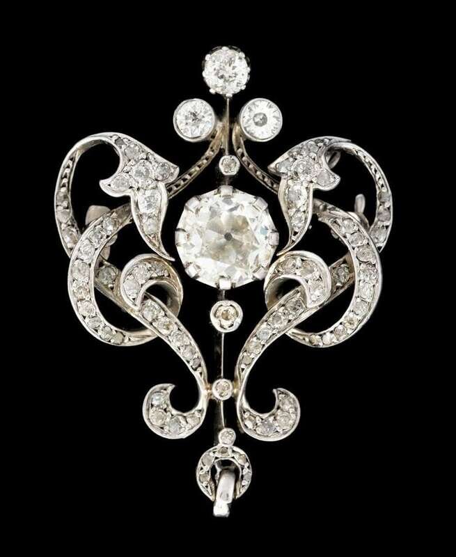 Center Old Mine cut diamond, approximately 2.5 carats, framed by pave diamond foliate motif. Brooch displays three .20 carat Old Mine cut diamonds at top.