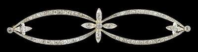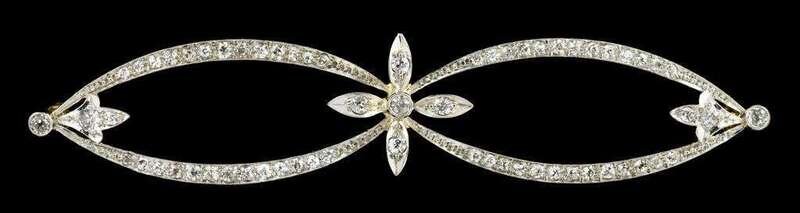 Platinum topped yellow gold bow shaped displaying sixty-two petite round cut diamonds ranging from .025 to .07 carats.