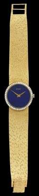 Round lapis face signed "Piaget", numberless dial, diamond set bezel, mechanical movement, reverse of case serial no. 9706B68/186463, textured yellow gold wrist band.