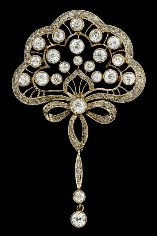 Articulated garland and berry motif pendant displaying twenty-two collet set Old Mine cut diamonds.