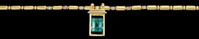 Step cut emerald pendant in geometric tension setting, strung on yellow gold terminal and ball link chain, accented by petite round cut diamonds in center.