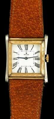 Square case, white enamel face with Roman numeral and dash dial, signed by the maker, mechanical movement, reverse of case serial no. 70270912, brown leather wrist band.
