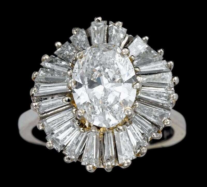 Single approximately 1.6 carat center oval cut diamond framed in traditional tapered baguette cut 'ballerina' setting, total diamond weight approximately 3 carats.