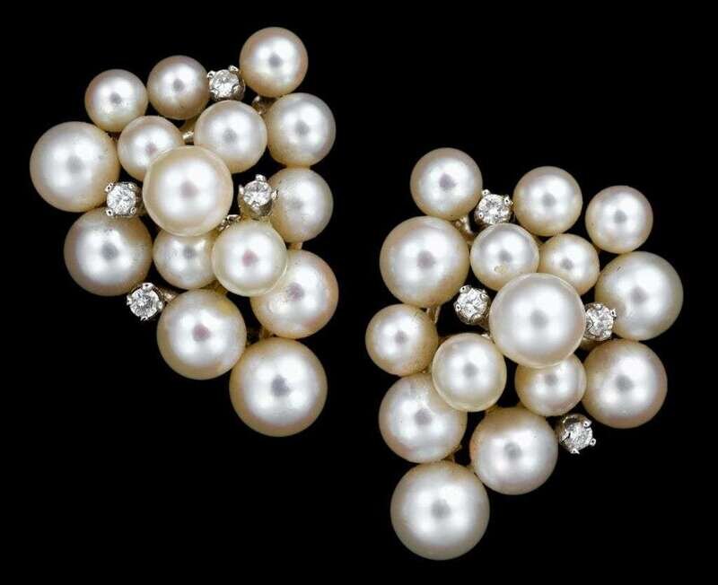 Grape cluster form consisting of fifteen pearls graduating in size 4.6 to 6.5mm, accented by four petite round cut diamonds, clip backings.