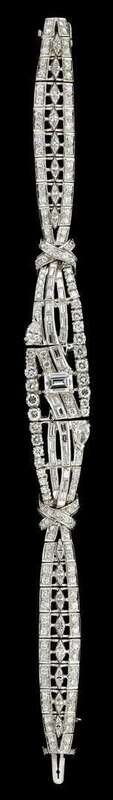 Center panel displays single emerald cut diamond .60 carat approximately, framed on either side by a single .30 carat pear shaped diamond, followed by criss-cross rows of channel set baguette cut diamonds with a round cut diamond frame. Articulated side panels display marquise cut diamond row framed by petite round cut diamonds on either side.