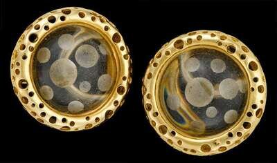 Rock crystal center with whimsical polka dot etching, 18 karat yellow gold surround, signed by the maker, French post and omega backing.