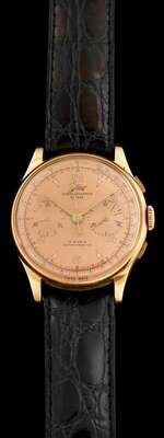 Circular case, rose tone face with Arabic numeral and dagger dial, signed by the maker, displaying subsidiary seconds and minutes dial, mechanical movement, black leather wrist band.