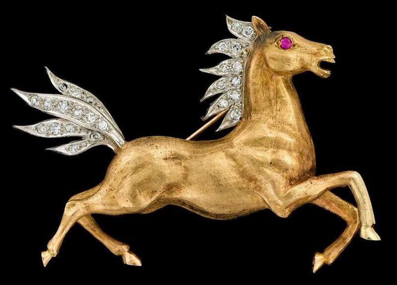 Florentine finished yellow gold galloping horse with diamond set mane and tail, pink sapphire eye.