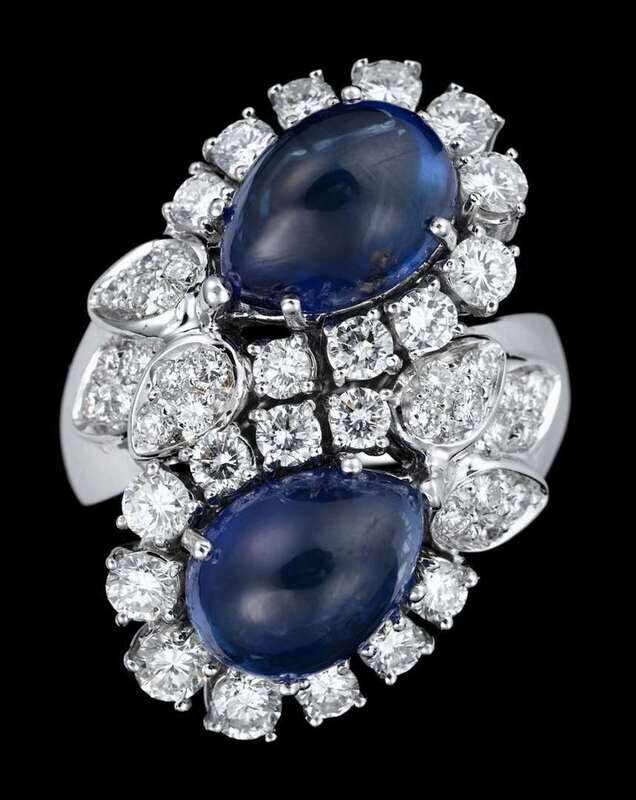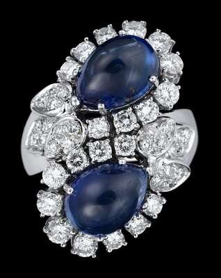 Wrap style ring displays double pear shape sapphire cabochons, prong set and surrounded by petite round cut diamonds, each approximately .08 carats. Total diamond weight approximately 1.6 carats, displays French export marks.