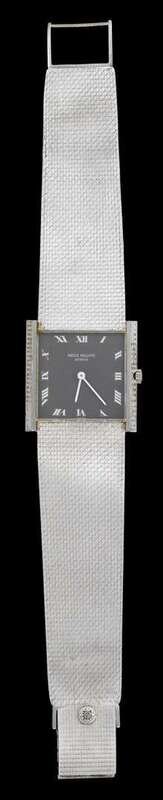 Square case, grey tone face with Roman numeral dial, signed by the maker, mechanical movement, textured white gold wrist band.