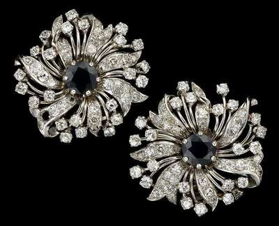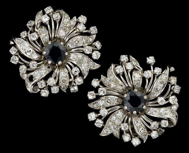 Single round cut blue sapphire framed by floral form diamond setting, total carat weight approximately 5.5 carats.