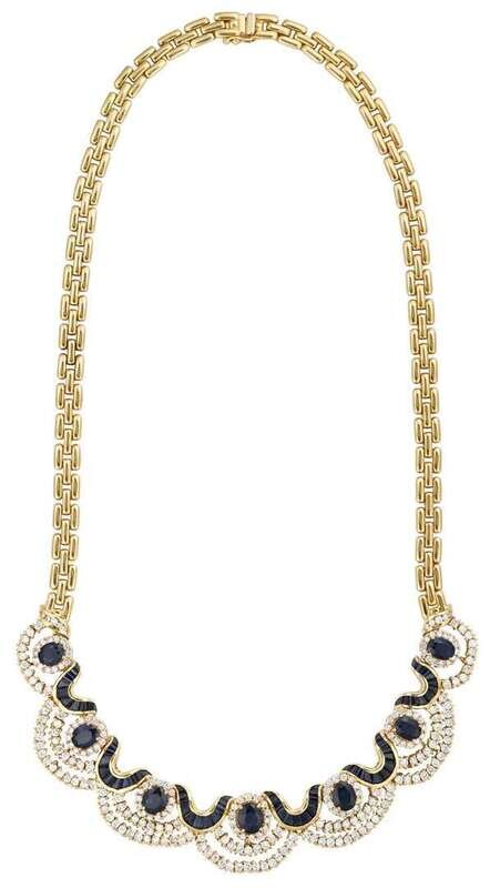 Garland style displaying seven oval cut sapphires framed by fourteen petite round cut diamonds approximately .03 carats each, above double articulated swags of .05 carat round cut diamonds, each sapphire interspersed by a swag of ten caliber cut sapphires, on a brick link gold chain.