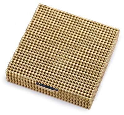 Square ball link compact with sapphire clasp, signed by the maker and accompanied by original case.