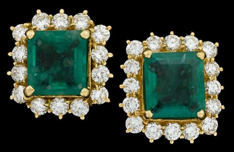 Step cut emerald framed by sixteen petite round cut diamonds.