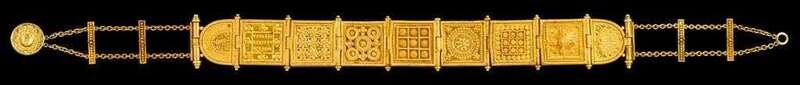 Choker style necklace composed of nine square panels of varying 'Etruscan' design and style followed by a petite curb link and Helios clasp. Reverse signed "Executed by Eduardo Melillo Under the Direction of Giacinto Melillo, Napoli Marzo 1899", and 'GM' signature on far right panel. Note: Giacinto Melillo was appointed by the Castellani family to manage the Castellani work shop in Naples. Melillo took the work shop as his own in 1865 continuing to produce jewelry in the Castellani 'Archeological style'. Having won the Legion D'honneur at the Paris Exposition Universelle in 1900, he is recognized as having produced much of the jewelry Allessandro Castellani displayed and sold bearing the Castellani hallmark in the 1878 Paris Exposition Universelle. A matching piece is currently with the British Museum, London gifted from Professor and Mrs. John Hull Grundy, and is known to be based on jewelry from the Campana Collection which the Castellani family was well aquianted. For similar examples please see 'Understanding Jewellery', Benett, David and Masceti, Daniela page 252, plates 404 and 405.