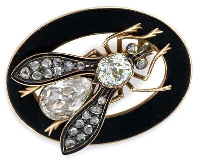 One Old Mine cut diamond approximately .5 carats and one modified pear shaped diamond set 'abdomen' approximately 1.25 carats, wings set with eighteen rose cut diamonds, within a circular black enamel frame.